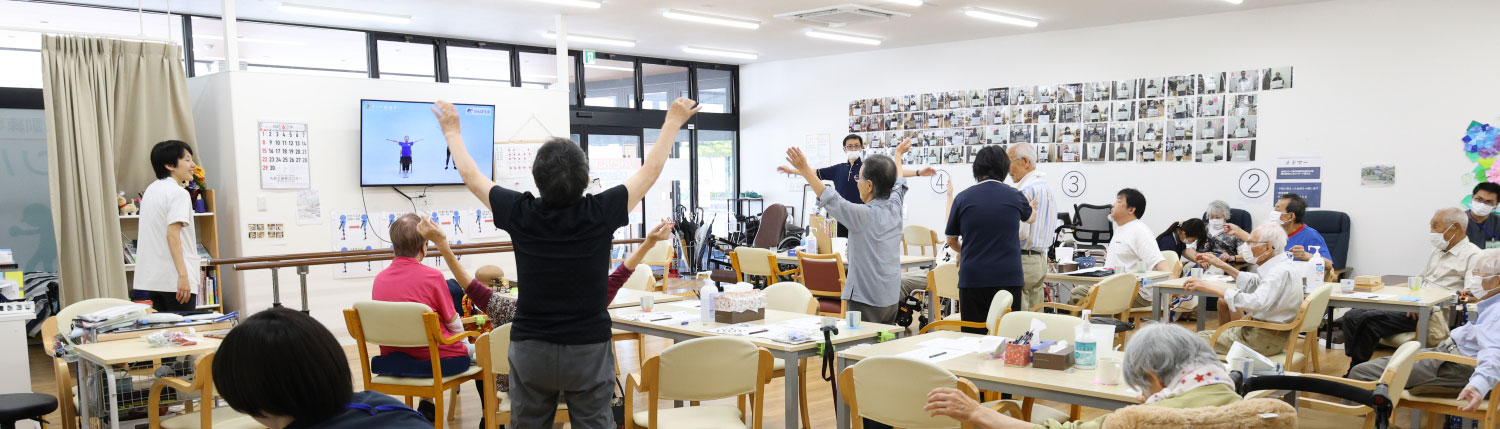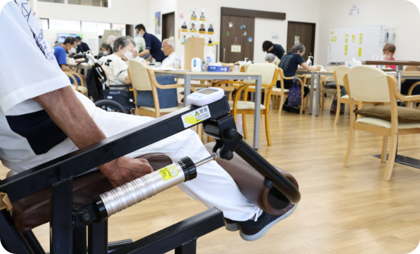 朝から夕方の時間の中で、機能訓練を中心としたリハビリと食事や入浴サービスをご提供します。リハビリでは、おひとりおひとりの状況にあった生活動作の練習、そして食事や入浴サービスでは、介助の必要な方に食事介助や入浴介助を行います。半日型と比較して、重症度が高い方も受け入れが可能となるリハビリデイサービスです。