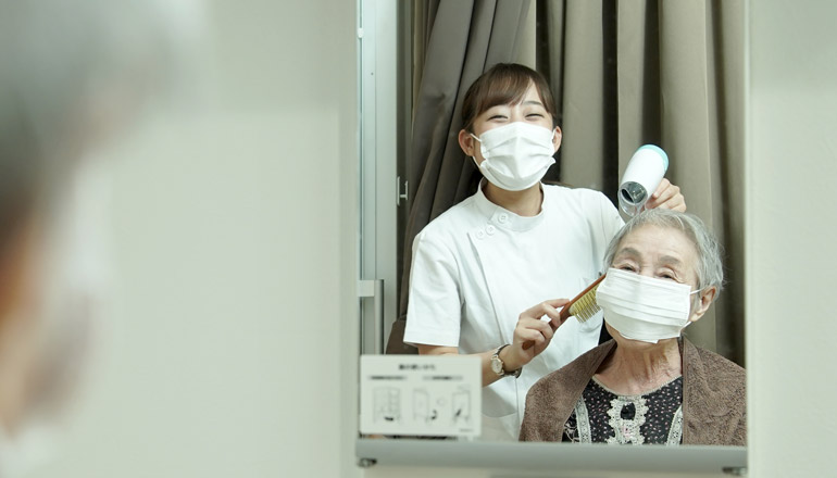 バイタルチェックや利用者様の服薬管理、食事提供時の介助、入浴介助などです。またリハビリ補助として機器への誘導や、移動介助などを行い、機能訓練をサポートします。1日の体調をご家族への報告も看護師の役割です。