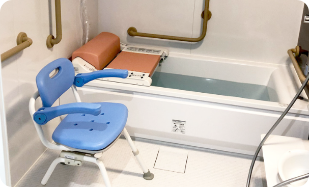 手すりの設置や出入り口も安心設計で、浴槽へ入ることが難しい方でも入浴できるよう入浴用リフトを使用しています。