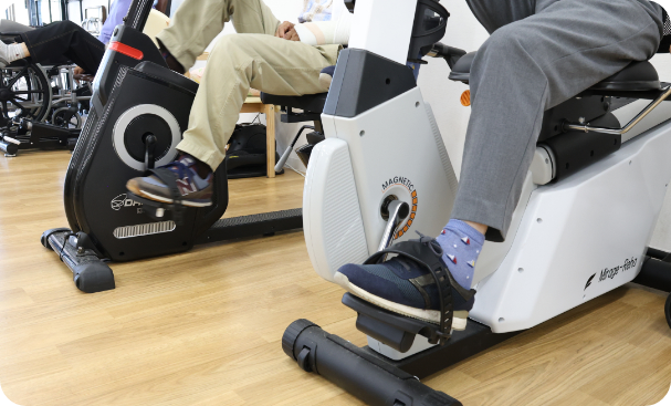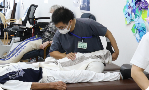 リハビリの専門職である理学療法士を中心とした医療従事者の看護師、柔道整復師、介護職、生活相談員などの専門家のサポートのもとリハビリ、機能訓練を受けることができる。