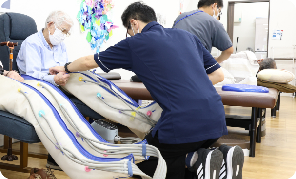 リハビリの専門家である理学療法士が、理学療法を用いて病気、けが、高齢、障害などによって運動機能が低下した状態にある利用者様に対し、日常生活を行う上で基本となる動作の回復や悪化予防を目的に動作の分析を行い、お一人お一人個別のリハビリプログラムを作成した上でリハビリを行います。