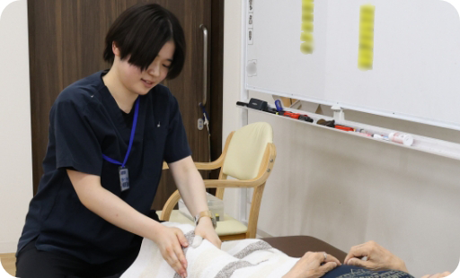 柔道整復師は身体に麻痺や機能障害をもつ人に対し、訓練や指導を行う専門家です。機能訓練指導員としてケガや病気、加齢などによって日常生活に支障をきたし始めた方が、健康で自立した生活を送ることができるように、リハビリや機能訓練のサポートを行います。