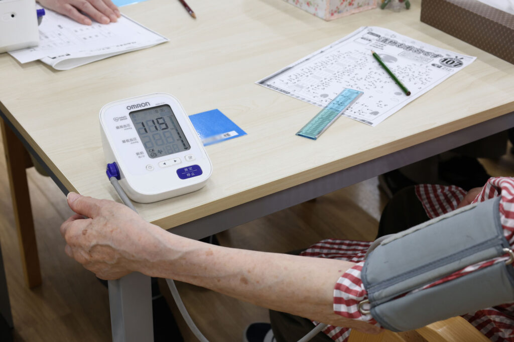 脳トレをしている間に、職員が血圧測定など朝の健康チェックをしてまわります。